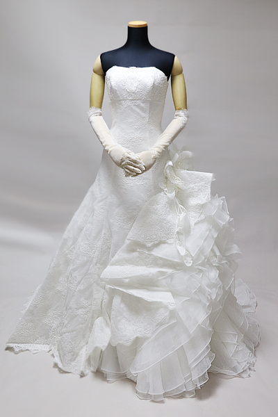 左右非対称のボリュームのあるレースが華やかで、Aラインとマーメイドラインの美味しいとこどりなデザインだと思います。